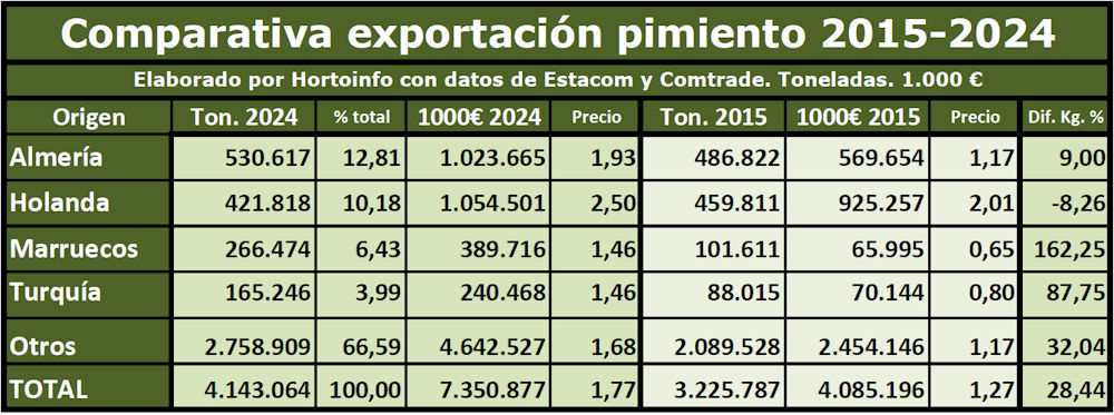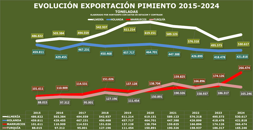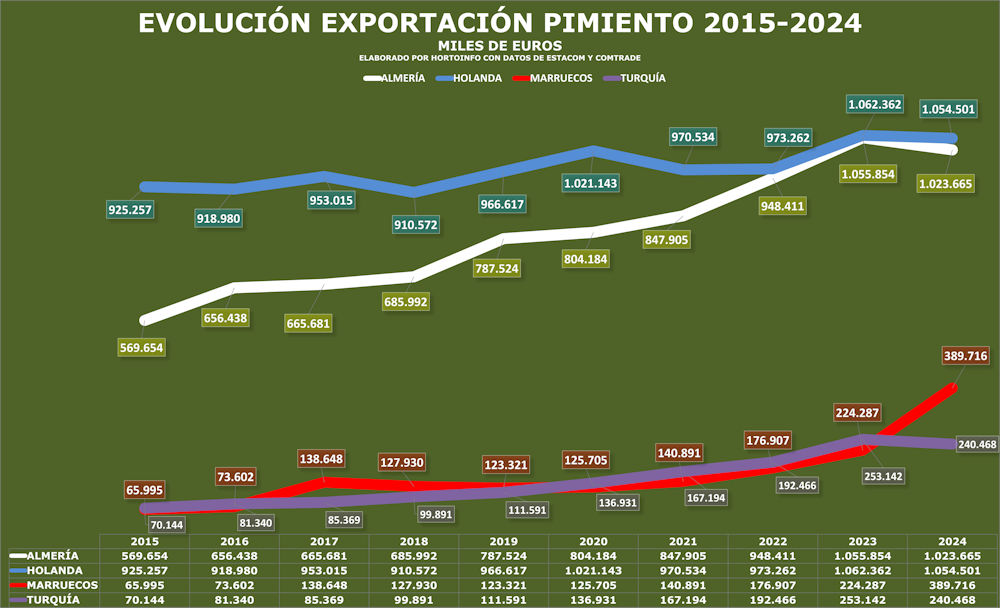 En 2024 Almería exportó 530,62 millones de kilos de pimiento, el 62,82% del total español. La exportación de Holanda fue de 421,82 millones de kilos, la de Marruecos de 266,47 millones, y la de Turquía de 165,25 millones de kilos