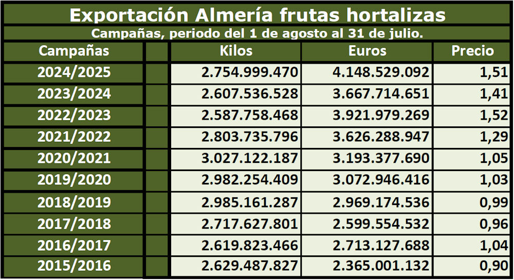 La cifra total de ingresos que han obtenido los exportadores almerienses por la exportación de frutas y hortalizas durante la campaña 2024/2025 ha sido de 4.148,53 millones de euros, la más alta de la historia, correspondientes a la venta al exterior de un volumen de productos hortofrutícolas de 2.755 millones de kilos, a un precio medio de 1,51 euros por kilo.