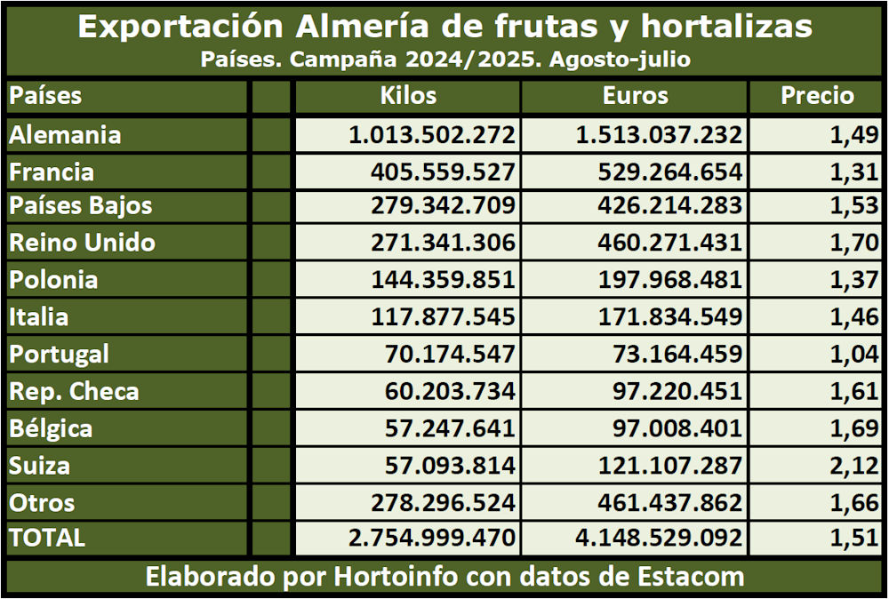 En la campaña 2024/2025 la provincia de Almería ha batido el récord histórico por ingresos en la exportación de hortalizas y frutas, según refleja el informe que ha elaborado Hortoinfo utilizando datos procedentes del servicio estadístico Estacom (Icex-Agencia Tributaria), con códigos TARIC, contemplando el periodo comprendido entre el 1 de agosto de 2024 y el 31 de julio de 2025.