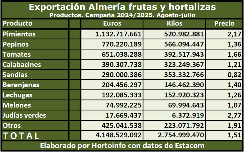 En la campaña 2024/2025 la provincia almeriense ha ingresado 4.148,53 millones de euros por exportar un volumen de 2.755 millones de kilos de hortalizas y frutas. Lidera el pimiento con 1.132,72 millones de euros, seguido por el pepino con 770,22 y el tomate con 651,04 millones de euros