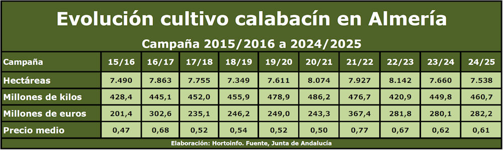 El volumen del calabacín que se ha producido en los invernaderos de Almería en la campaña 2024/2025 ha aumentado en un 2,41 por ciento con respecto al correspondiente a la campaña anterior, a pesar de que la superficie destinada a su cultivo se ha reducido en -1,59 por ciento, según ha podido corroborar Hortoinfo al consultar documentos del Observatorio de Precios y Mercados de la Junta de Andalucía.