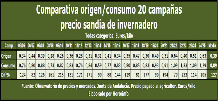 En las últimas 20 campañas el precio que se ha pagado al productor de sandía en invernadero ha pasado de los 0,34 euros/kilo en la campaña 2005/2006 a los 0,63 euros por kilo en la 2024/2025 con un aumento del 85,29 por ciento, mientras que el consumidor pagó la sandía que compró en la campaña 2005/2006 a una media de 0,76 euros por kilo, precio medio que subió en la pasada campaña 2024/2025 hasta los 1,29 euros/kilo, lo que representa un incremento del 69,73 por ciento.