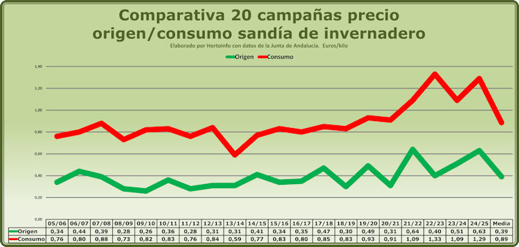 En cuanto a los consumidores, comenzaron la serie de las veinte campañas pagando la sandía a una media de 0,76 euros por kilo alcanzando el precio medio más alto en la 2022/2023 con 1,33 euros por kilo, con el precio más bajo en la campaña 2013/2014 con una media pagada por los consumidores de 0,59 euros por kilo.