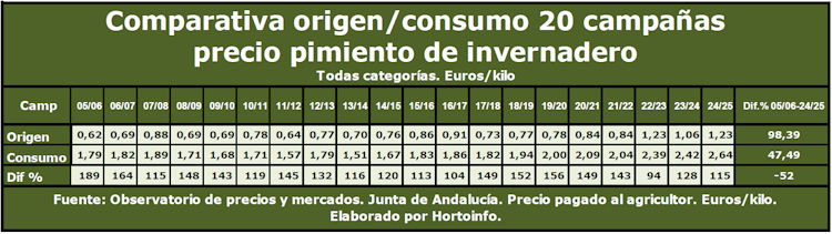 En las últimas 20 campañas el precio que se ha pagado al productor de pimiento en invernadero ha pasado de los 0,62 euros/kilo en la campaña 2005/2006 a los 1,23 euros por kilo en la 2024/2025 con un aumento del 98,39 por ciento, mientras que el consumidor pagó el pimiento que compró en la campaña 2005/2006 a una media de 1,79 euros por kilo, precio medio que subió en la pasada campaña 2024/2025 hasta los 2,64 euros/kilo, lo que representa un incremento del 47,49 por ciento.