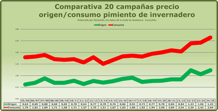 El diferencial más alto se dio en la campaña 2005/2006 con un 189 por ciento, en la que al agricultor se le pagó el pimiento a 0,62 €/kg y el consumidor lo pagó a 1,79 €/kg, mientras que la diferencia más pequeña entre el precio al agricultor y al consumidor tuvo lugar en la campaña 2022/2023, con un diferencial del 94 por ciento al haberse pagado al productor a una media de 1,23 euros por kilo mientras que el precio medio al que los consumidores pagaron el pimiento en esa campaña fue de 2,39 euros por kilo.