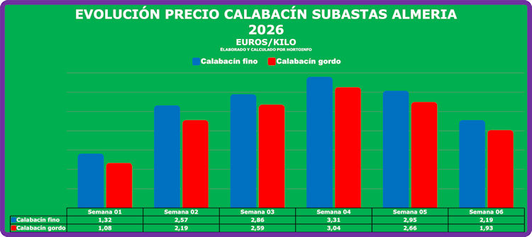 En los calabacines, el fino ha bajado de los 2,95 euros por kilo con los que cerró de media la semana cinco a los 2,19 euros/kilo de la semana seis, mientras que el gordo cae de 2,66 a 1,93 euros por kilo.