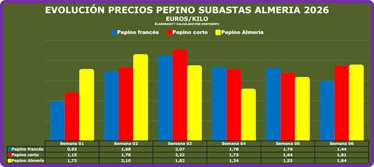 El pepino tipo francés es el único que baja desde la semana cinco a la seis, al pasar de un precio medio en la cinco de 1,76 euros por kilo a los 1,44 euros/kilo con los que cerró la semana seis como precio medio semanal. En sentido contrario, el pepino corto sube de 1,64 a 1,81 euros por kilo de la semana cinco a la seis y el pepino tipo Almería asciende de una cotización media de 1,53 de la semana cinco a los 1,84 euros por kilo en la seis.