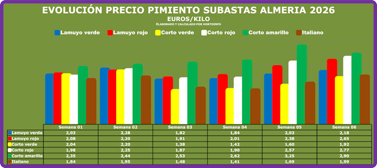 Suben los precios medios semanales de los pimientos exceptuando el del tipo corto amarillo. El pimiento Lamuyo verde pasa de una cotización media de 2,03 euros por kilo en la semana cinco a los 2,18 euros por kilo en la semana seis, creciendo el precio medio del Lamuyo rojo desde los 2,38 euros por kilos a los que cotizó de media durante la semana cinco a los 2,65 euros/kilo en la semana seis.