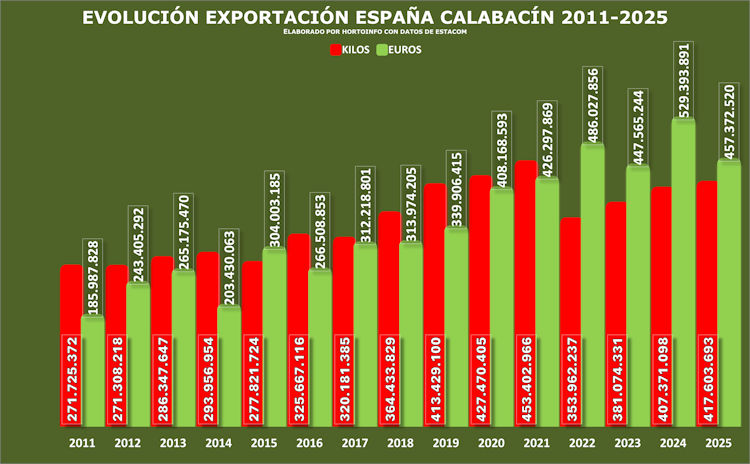 El valor alcanzado por la exportación de calabacín en 2025 ha sido de 457,37 millones de euros, un 135,16 por ciento más que el valor obtenido en el año 2011 cuando la cifra fue de 185,99 millones de euros.