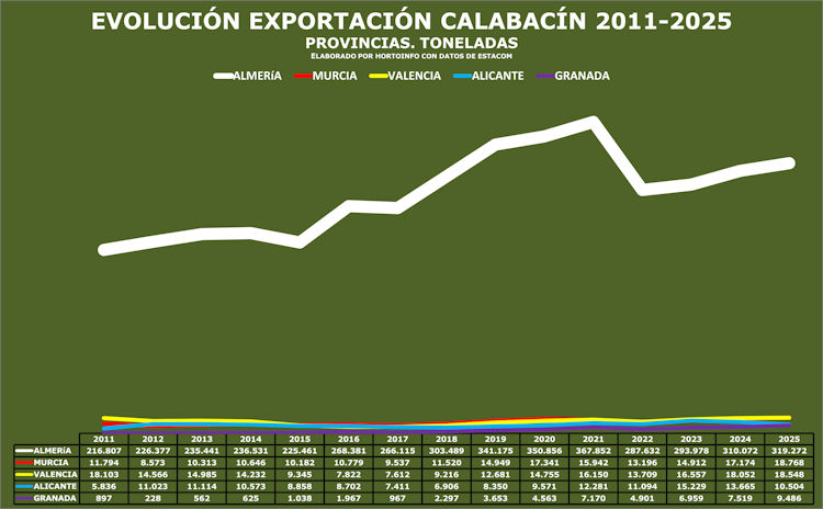 La provincia de Almería es la protagonista absoluta en la exportación española de calabacín ya que en 2025 salieron de esa provincia casi ocho de cada diez calabacines del total español, como muestra el informe elaborado por Hortoinfo con datos procedentes del servicio estadístico Estacom (Icex-Agencia Tributaria), referidos al código 07099310 del Arancel Integrado de las Comunidades Europeas – TARIC (Tariff Integrated of the European Communities).