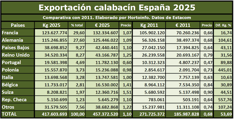 El volumen total de calabacín exportado por España en 2025 ha crecido un 53,69 por ciento con respecto a las exportaciones realizadas quince años antes, ya que en 2011 el volumen de calabacín español enviado a los mercados exteriores fue de 271,72 millones de kilos frente a los 417,6 millones de kilos exportados en 2025.