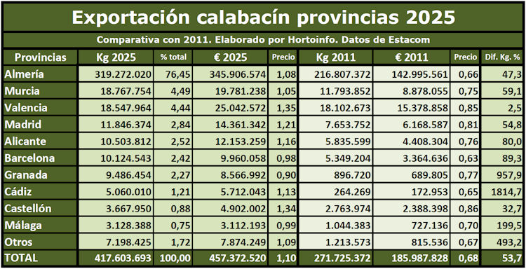 Almería encabezó en 2025 la exportación de calabacín desde España, ocupando un primer lugar muy destacado entre las provincias que más calabacín exportaron con el 76,45 por ciento del total y un volumen de 319,27 millones de kilos, por los que ingresó 345,91 millones de euros. El precio medio al que Almería exportó sus calabacines en 2025 ha sido de 1,08 euros por kilo.