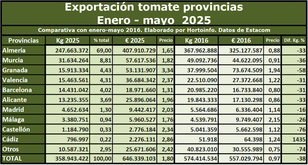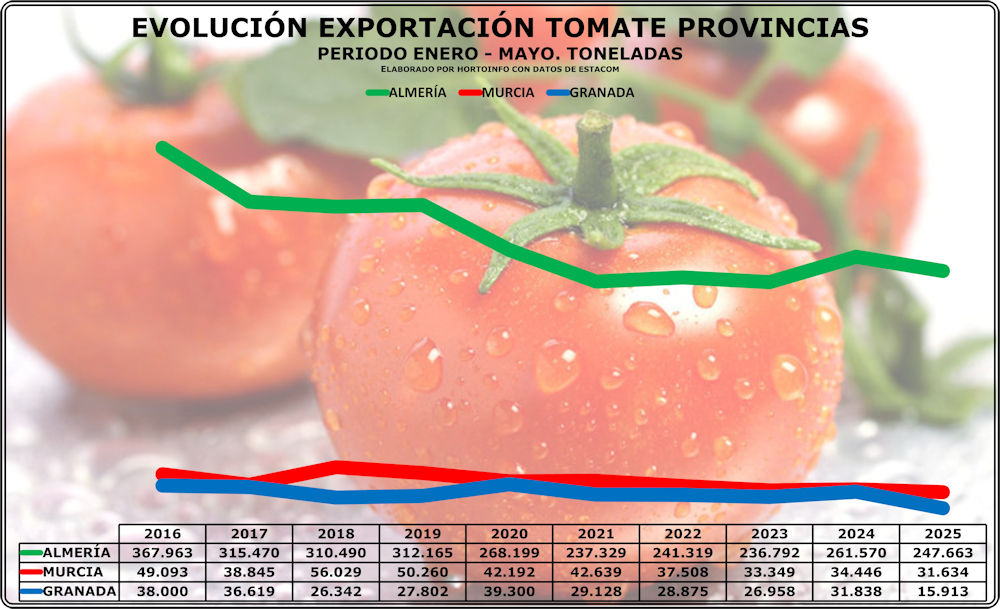 El 69 por ciento de los tomates que ha exportado España entre enero y mayo de 2025 han salido de la provincia de Almería, que ocupó el primer lugar entre las provincias que más tomate exportaron con un volumen de 247,66 millones de kilos por los que ingresó 407,91 millones de euros, con un precio medio de 1,65 euros por kilo. En los últimos 10 años Almería ha reducido sus exportaciones de tomate un -33 por ciento, desde los 367,96 millones de kilos que exportó en los mismos meses de 2016.