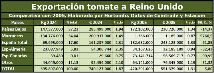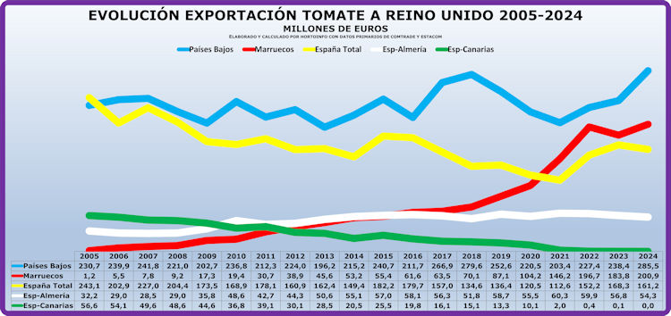 Comparativa 20 años exportación de tomate a Reino Unido desde España, Holanda, Marruecos, Canarias y Almería