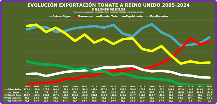La progresión ascendente de Marruecos ha sido espectacular desde los 1,4 millones de kilos que exportó a Reino Unido en 2005 a los 134,8 millones de kilos de 2024, habiendo llegado a superar a las ventas neerlandesas en 2022, cuando Holanda exportó a Reino Unido 124,2 millones de kilos de tomate mientras que las ventas marroquíes alcanzaron la cifra de 144,3 millones de kilos, pero en 2023 el primer lugar entre los proveedores de tomate al mercado británico fue recuperado por Holanda al descender el volumen llegado a ese mercado desde Marruecos y recuperarse el de Holanda, país que en 2024 ha vendido a Reino Unido 147,4 millones de kilos de tomate frente a los 134,8 millones de kilos de Marruecos.