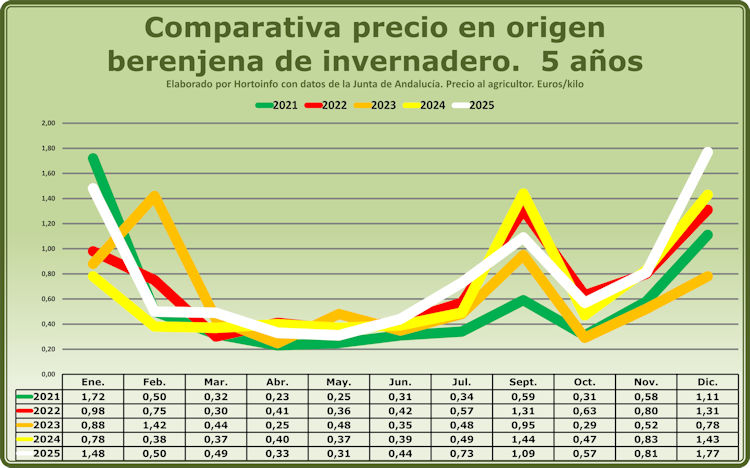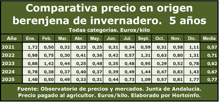La serie histórica comienza en el año 2021 con un precio medio durante el año de 0,57 euros por kilo, en 2022 subió hasta los 0,71 euros el kilo para volver a bajar en 2023 hasta una media anual de 0,62 euros por kilo, para volver a subir en 2024 hasta un precio medio del año de 0,67 euros el kilo de berenjena, remontando en 2025 hasta la cifra ya citada de 0,77 euros por kilo de berenjena cultivado en los invernaderos.