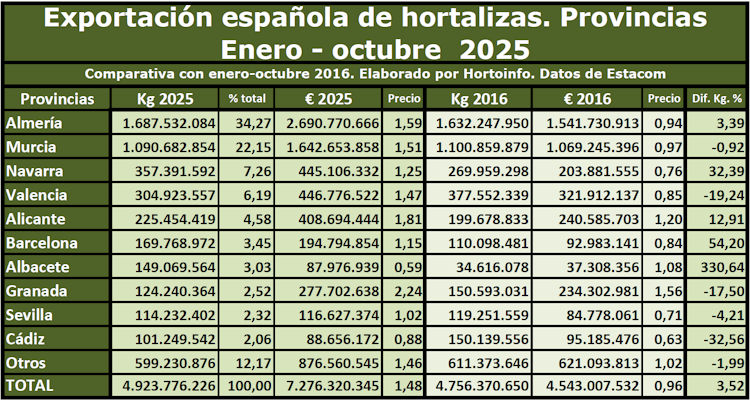 A nivel nacional, la exportación de hortalizas entre enero y octubre de 2025 alcanzó los 4.923,78 millones de kilos, un 3,52 por ciento más que diez años antes, vendidos al exterior por un valor de 7.276,32 millones de euros a un precio medio de 1,48 euros por kilo.