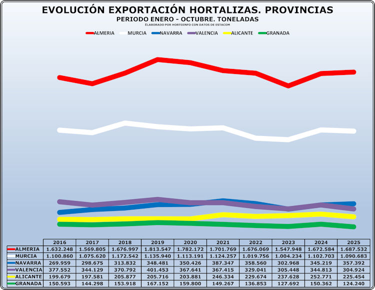 Desde las provincias de Almería y Murcia salieron más de la mitad de las hortalizas que exportó España entre el 1 de enero y el 31 de octubre de 2025, en concreto el 56,42 por ciento del total, según recoge el informe que ha elaborado Hortoinfo basado en datos procedentes del servicio estadístico Estacom (Icex-Agencia Tributaria), con códigos del Arancel Integrado de las Comunidades Europeas – TARIC.