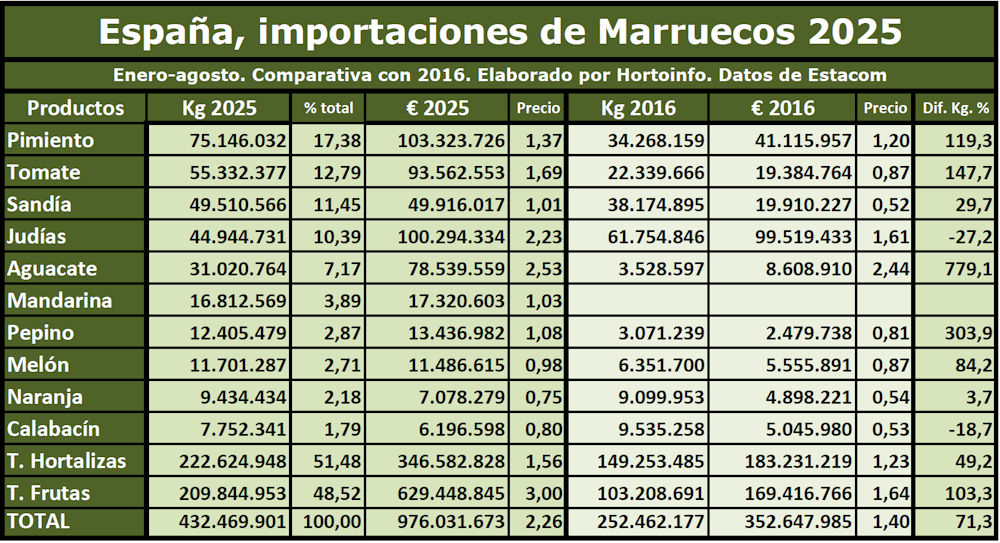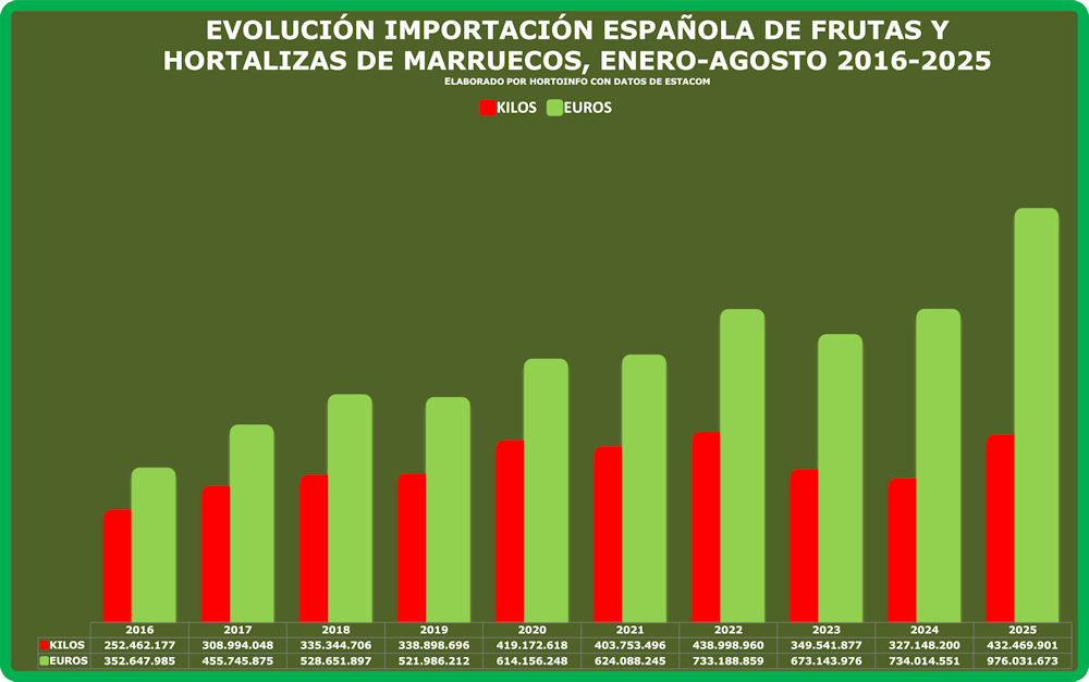 Entre el 1 de enero y el 31 de agosto de 2025 España ha pagado a Marruecos casi mil millones de euros por comprarle hortalizas y frutas, según el informe elaborado por Hortoinfo con datos procedentes del servicio estadístico Estacom (Icex-Agencia Tributaria), con códigos del Arancel Integrado de las Comunidades Europeas – TARIC.