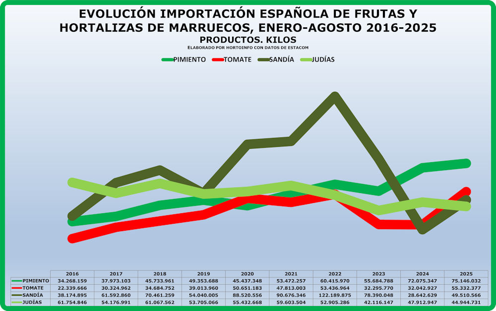 El producto que más se ha importado desde Marruecos por las empresas españolas en los ocho primeros meses de 2025 ha sido el pimiento con 75,15 millones de kilos, el 17,38 por ciento del total de hortalizas y frutas, por un valor de 103,32 millones de euros y un precio medio de 1,37 euros por kilo. El volumen ha sido un 119,3 por ciento mayor que diez años antes, ya que entre enero y agosto de 2016 se importó desde Marruecos una cantidad de pimiento de 34,27 millones de kilos, por un valor de 41,11 millones de euros, a un precio medio de 1,20 euros por kilo.