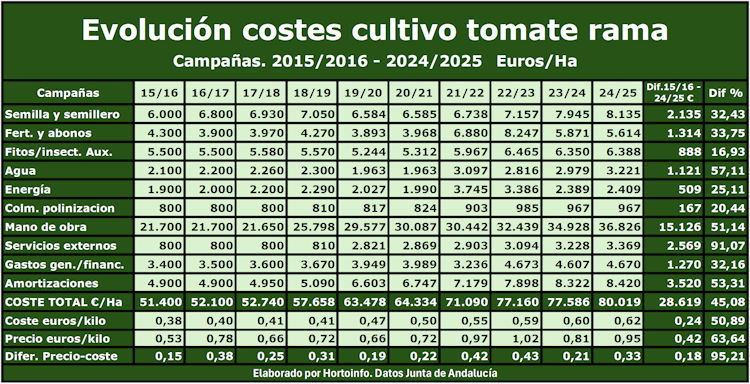 El coste de cultivar una hectárea de tomate en los invernaderos de la provincia de Almería ha aumentado en las últimas diez campañas en 28.619 euros, pasando de 51.400 euros por hectárea en la campaña 2015/2016 a unos costes de 80.019 euros por cada hectárea en la campaña 2024/2025, un 45,08 por ciento más.