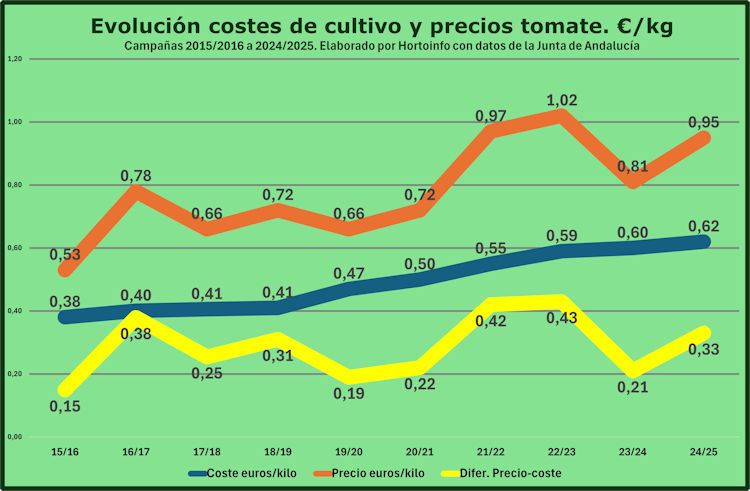 Ha pasado de 51.400 euros por hectárea en la campaña 2015/2016 a 80.019 €/ha en la campaña 2024/2025, un 45,08% más. Teniendo en cuenta los diferentes rendimientos de cada campaña el precio por kilo ha aumentado un 50,89% y el precio obtenido por cada kilo de tomate crece un 63,64%