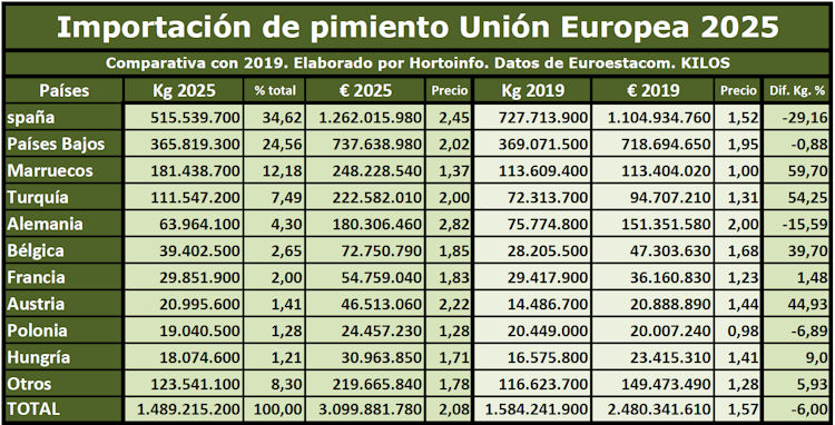 En total, los Estados miembros de la UE han comprado en 2025 un volumen de 1.489,21 millones de kilos de pimiento, un 6 por ciento menos que en 2019, por un valor de 3.099,88 millones de euros, a un precio medio de 2,08 euros por kilo.