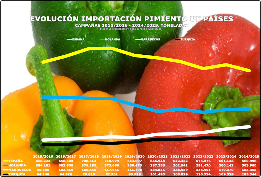 A pesar de su posición dominante, España ha reducido en las últimas 10 campañas un -9,26% sus ventas de pimiento en la UE y Holanda las ha bajado un -20,88%, mientras que Marruecos las aumentó un +93,96% y Turquía un +64,28%