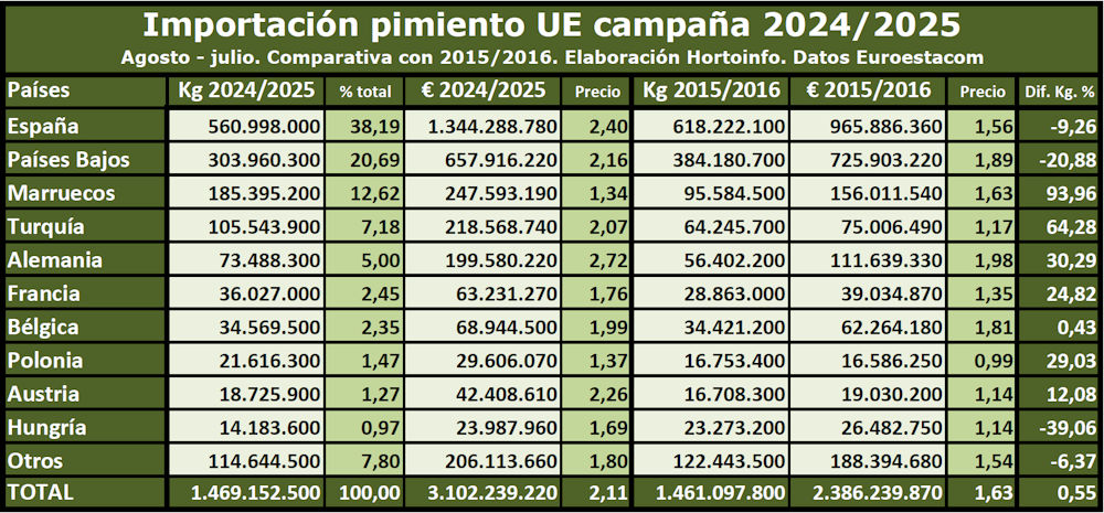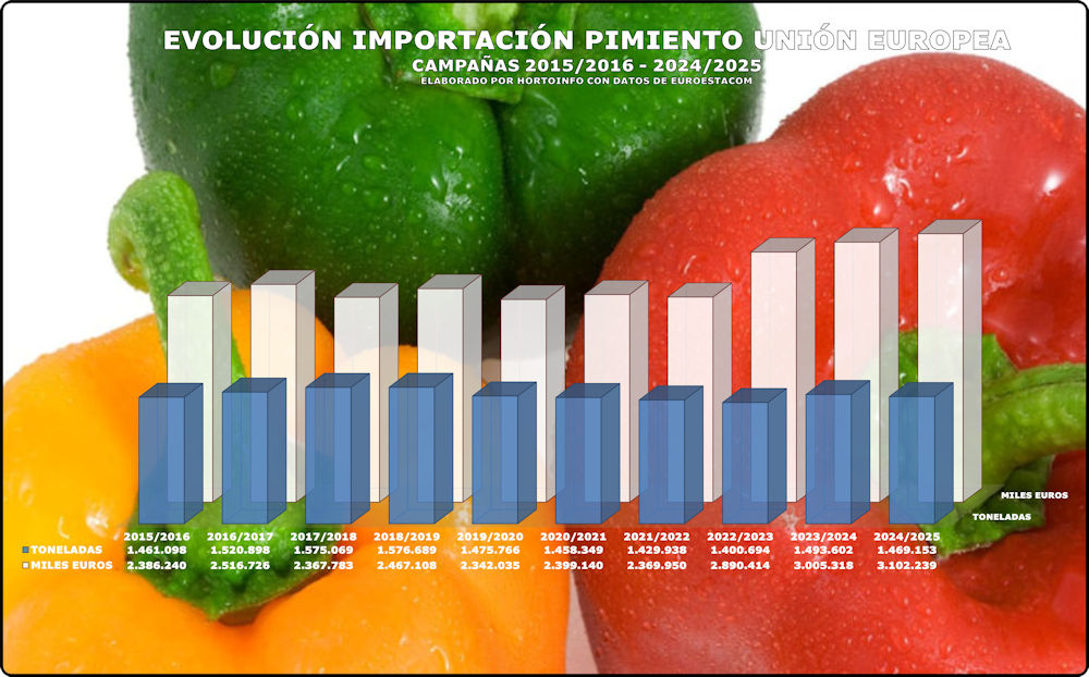 El volumen total de pimiento importado por los Estados miembros de la UE durante la campaña 2024/2025 ha sido 1.469,15 millones de kilos comprados por un valor de 3.102,24 millones de euros, con un precio medio pagado por esos pimientos de 2,11 euros por kilo.