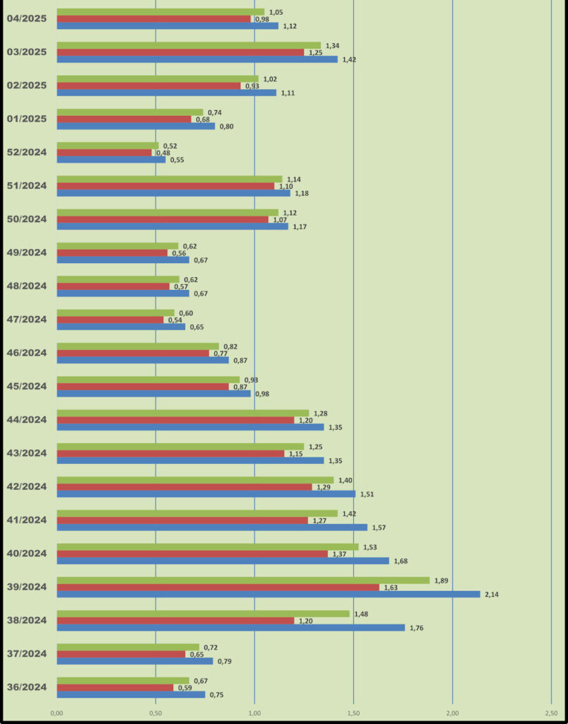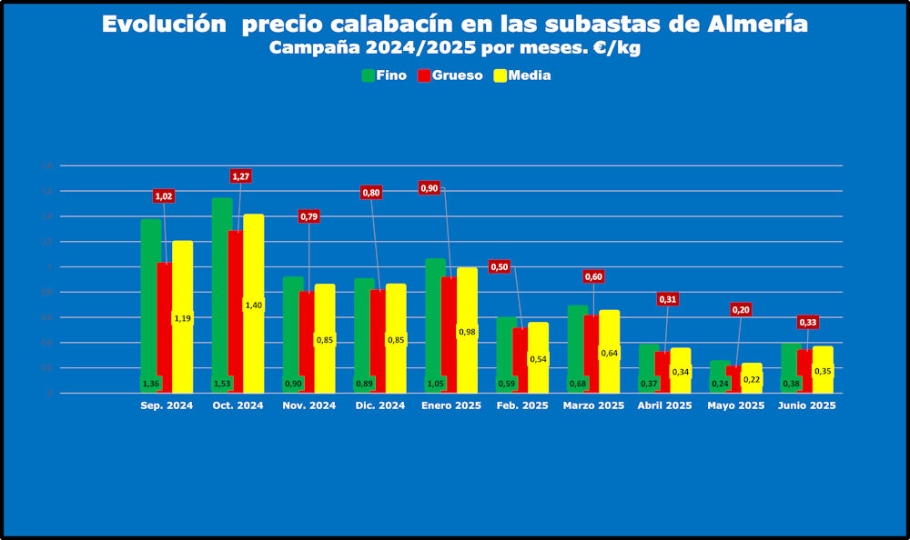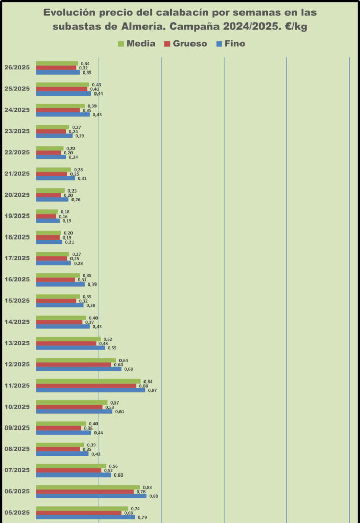 El calabacín verde fino comenzó la campaña en septiembre de 2024 con una media de los precios semanales de 1,36 euros por kilo, en octubre esa media semanal subió hasta los 1,53 euros por kilo, bajando en noviembre a un precio medio semanal de 0,90 euros por kilo y de 0,89 euros el kilo como media semanal en el mes de diciembre. En enero ya de este año 2025 subió hasta un precio medio de 1,05 euros por kilo y en febrero bajó hasta la cifra de 0,59 euros por kilo, continuando en marzo con un precio medio de 0,68 euros por kilo, que en abril baja a 0,37 euros por kilo y cae en mayo a una media semanal de 0,24 euros por kilo, para recuperar en parte pero sin llegar a cubrir los costes en junio hasta una media en las cotizaciones semanales en las subastas de 0,38 euros por kilo.
