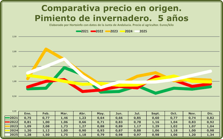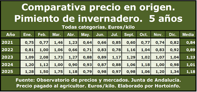 Los pimientos cultivados en los invernaderos andaluces, principalmente en los almerienses, han cotizado este año 2025 a un precio medio de 1,18 euros por kilo, un 16,83 por ciento más que el pasado año 2024 en el que el precio medio fue de 1,01 euros por kilo. Sin embargo, la media de este año ha sido un 4,06 por ciento inferior al precio medio conseguido dos años antes, ya que en 2023 el precio medio recibido por los productores de pimiento en invernadero fue de 1,23 euros por kilo.