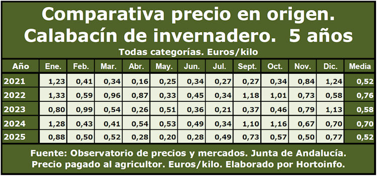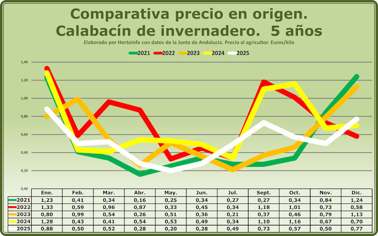 La serie quinquenal comienza en el año 2021 con un precio medio durante el año de 0,52 euros por kilo, en 2022 subió hasta los 0,76 euros el kilo, volvió a descender en 2023 hasta una media anual de 0,58 euros por kilo, para remontar en 2024 hasta un precio medio del año de 0,70 euros el kilo de calabacín, bajando en 2025 hasta la cifra de 0,52 euros por kilo de calabacín cultivado en los invernaderos, la misma que cinco años antes al coincidir con el precio medio de 2021.