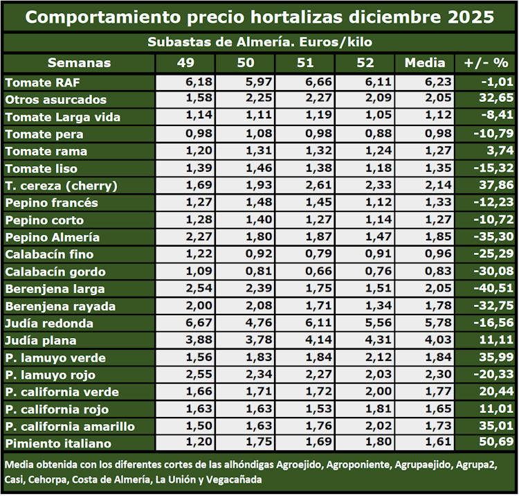 Los precios medios en las subastas de Almería de la berenjena negra/larga se han desplomado un -40,51 por ciento a lo largo del mes de diciembre desde la semana 49 a la 52, pasando de una media en sus cotizaciones de 2,54 euros por kilo de media en las diferentes subastas en la semana 49 para terminar la semana 52 con un precio medio de los diferentes cortes en las subastas almerienses de 1,51 euros por kilo y una media del mes de 2,05 euros por kilo, según el análisis de la evolución de los precios medios en las subastas de Almería basado en los precios medios que calcula Hortoinfo, sobre las cotizaciones alcanzadas cada día por las diferentes hortalizas en las subastas de la provincia almeriense.
