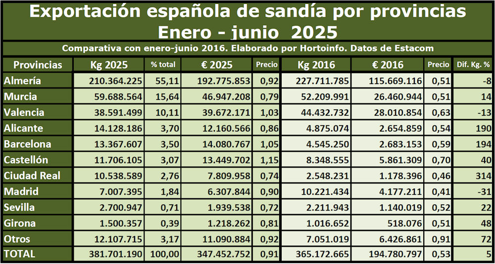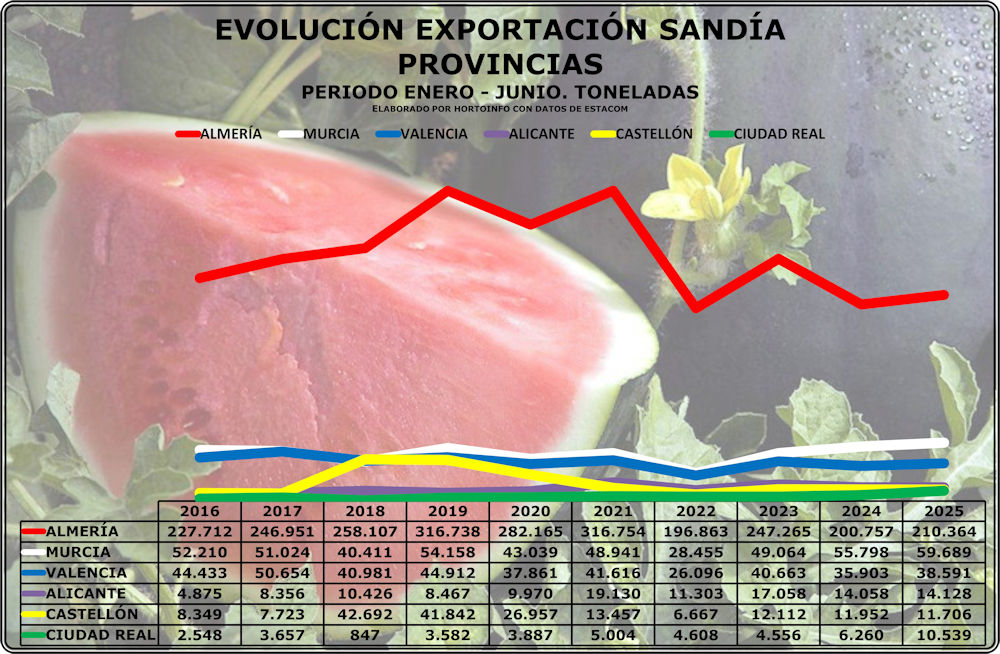 La exportación total española de sandía en el primer semestre del año fue de 381,7 millones de kilos, un 5% más que 10 años antes, de los que Almería exportó 210,36 millones de kilos, Murcia 59,69 y Valencia 38,59 millones de kilos