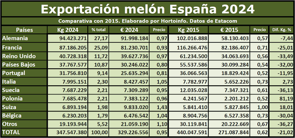 El 27,17 por ciento de los melones que ha exportado España en 2024 han tenido como destino los mercados de Alemania, con una reducción del -7,44 por ciento respecto a 2015, pasando de los 102,02 millones de kilos de 2015 a los 94,42 millones de kilos correspondientes a 2024, con un valor en el pasado año 2024 de 92 millones de euros y un precio medio de 0,7 euros por kilo.