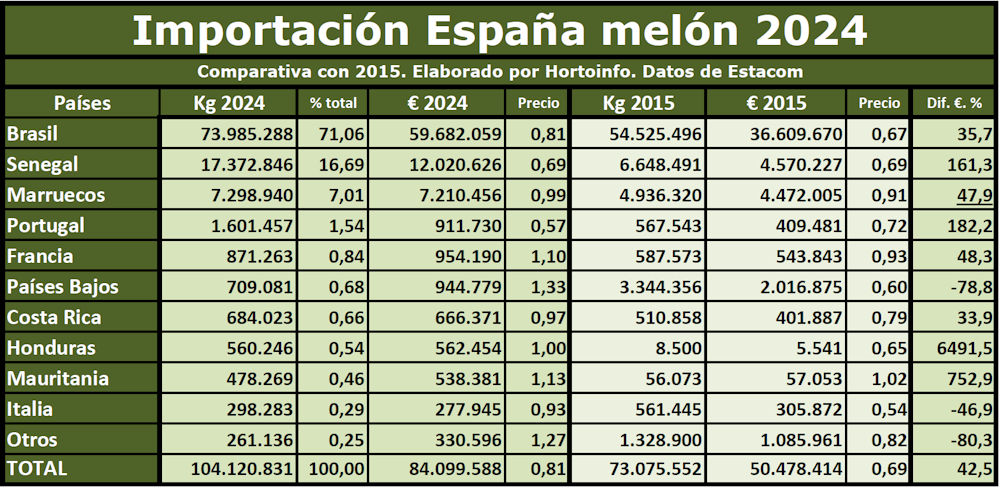 Brasil es tradicionalmente el principal proveedor de melón a España aumentando un 35,7 por ciento con respecto a 2015, desde los 54,52 millones de kilos en 2015 a los 73,98 millones de kilos en 2024. El valor de las compras de melón a Brasil este último año ha sido de 59,68 millones de euros, con un precio medio de 0,81 euros por kilo.