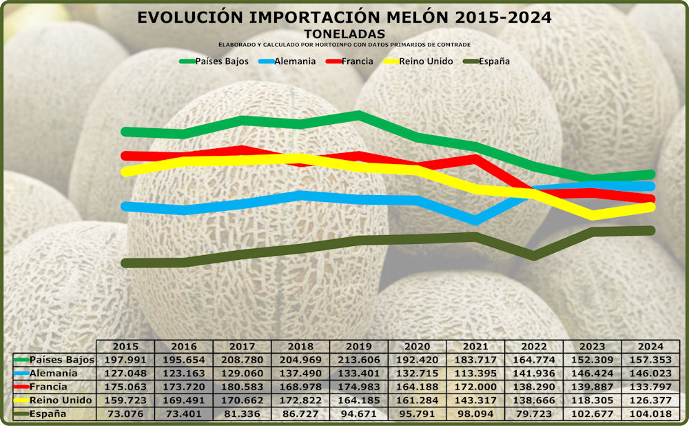 En los últimos diez años, desde 2015 a 2024, España aumentó un 42,34 por ciento el volumen de melón que compró a otros países y Alemania un 14,94 por ciento, mientras que Países Bajos (Holanda) las redujo un -20,53 por ciento, Francia un -23,57 y Reino Unido bajó sus importaciones de melón un -20,9 por ciento.