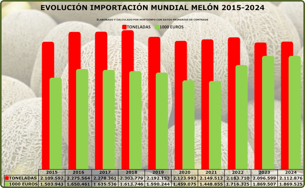 Teniendo en cuenta el total mundial, en 2024 se importaron 2.112,88 millones de kilos de melón por un valor de 1.869,52 millones de euros, a un precio medio de 0,88 euros por kilo. Diez años antes, en 2015, el volumen importado fue de 2.109,59 millones de kilos por un valor de 1.503,94 millones de euros, a 0,71 euros por kilo.