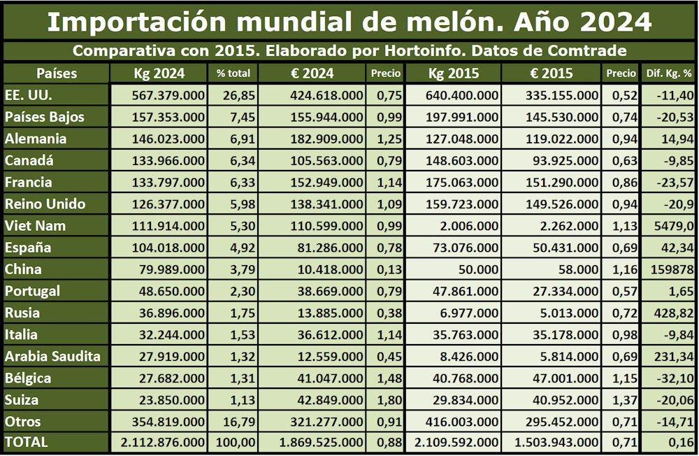Estados Unidos lideró en 2024 la importación mundial de melón con un volumen de 567,38 millones de kilos, el 26,85 por ciento del total, seguido por Holanda con 157,35 millones de kilos, el 7,45 por ciento del volumen mundial, con Alemania en tercer lugar al haber importado en 2024 un total de 146,02 millones de kilos de melón, el 6,91 por ciento de las importaciones mundiales de melón en el pasado año.