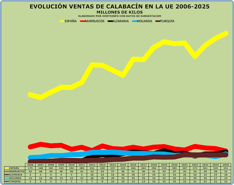 En 2025 España ha vendido en los mercados de la UE 331,34 millones de kilos de calabacín, seguida por Marruecos con 31,2 millones. En los últimos 20 años España ha aumentado un 89,5% la venta de calabacín en la UE, mientras que Marruecos las ha reducido un -25,23%