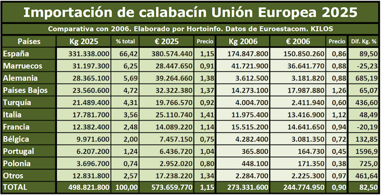 En total, las ventas de calabacín en los mercados comunitarios por parte de todos los países proveedores han alcanzado en 2025 los 498,82 millones de kilos, un 82,5 por ciento más que veinte años antes, ya que en 2006 fueron de 273,33 millones de kilos. El valor en 2025 ha sido de 573 millones de euros, a un precio medio de 1,15 euros por kilo, frente a los 244,77 millones de euros de 2006, año en el que el precio medio fue de 0,9 euros por kilo.
