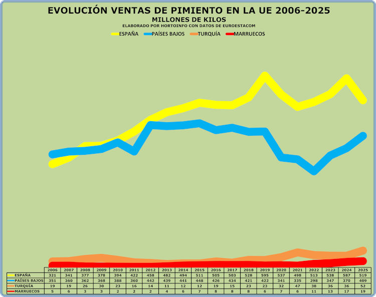 En 2025 España ha vendido en los mercados de la UE 518,97 millones de kilos de pepino y Holanda 408,61 millones. En los últimos 20 años España ha aumentado un 61,85% la venta de pepino en la UE, Holanda un 16,45%, Turquía un 180,27% y Marruecos un 257,1%