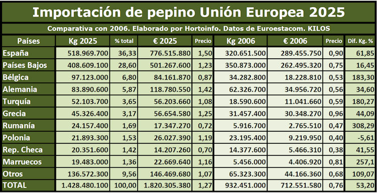 El valor de la venta española de pepino en la UE en el pasado año de 2025 ha alcanzado los 776,52 millones de euros, 487 millones de euros más que en 2006 gracias a que en el pasado 2025 los ha vendido a 1,5 euros por kilo, el precio más alto al que han vendido los pepinos los diez mayores proveedores, frente al precio medio de 0,9 euros/kilo en 2006.