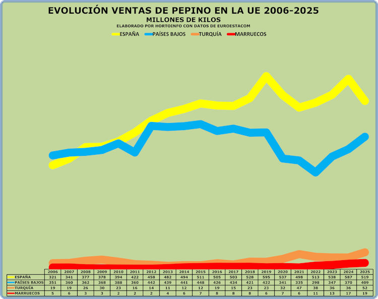 En 2025 España ha vendido en los mercados de la UE 518,97 millones de kilos de pepino y Holanda 408,61 millones. En los últimos 20 años España ha aumentado un 61,85% la venta de pepino en la UE, Holanda un 16,45%, Turquía un 180,27% y Marruecos un 257,1%