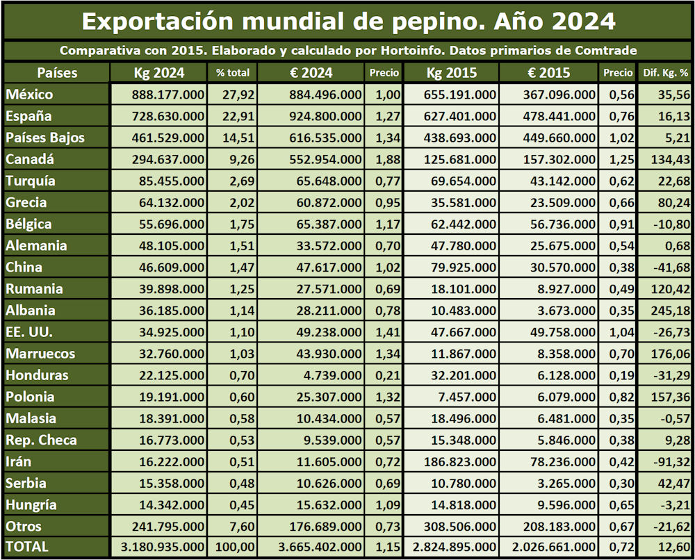En el pasado año 2024 entre México y España exportaron la mitad de los pepinos que se vendieron en el mundo según los datos obtenidos a través de Comtrade, un 50,83 por ciento del total. México exportó el 27,92 por ciento del volumen total con 888,18 millones de kilos y España el 22,91 por ciento del total mundial, con una cantidad de pepino exportada de 728,63 millones de kilos.