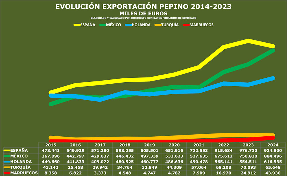 El valor de la exportación española de pepino fue durante el pasado año un 4,55% mayor que el de México, un 50% mayor que el de Holanda, superando en un 1.308% al de las exportaciones turcas y un 2.005% al de las de Marruecos.