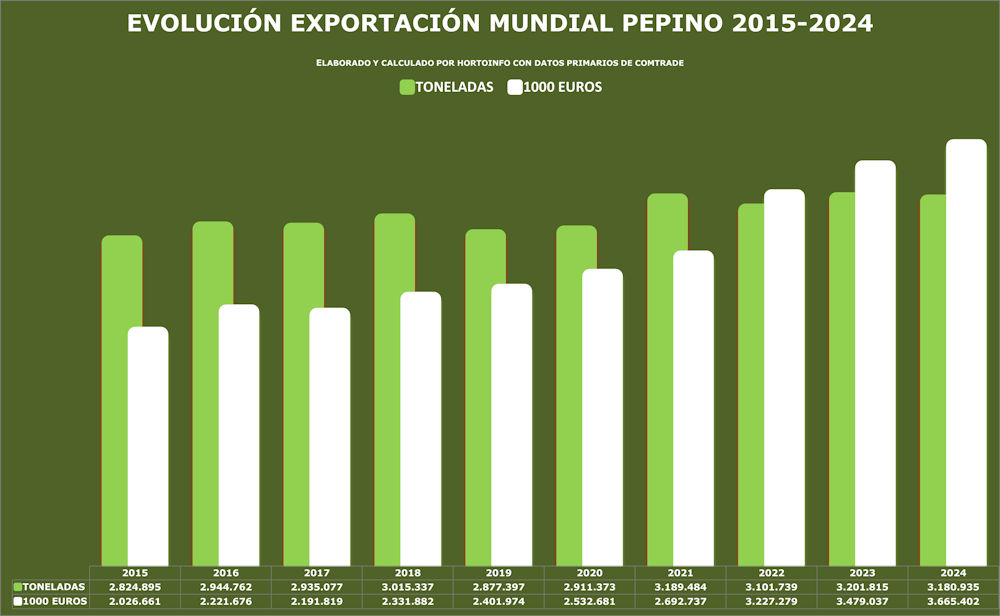 En el pasado año 2024 España fue el país de todo el mundo que más ingresos obtuvo por la exportación de pepino, con una cifra de 924,8 millones de euros obtenidos por vender esa hortaliza a otros países.