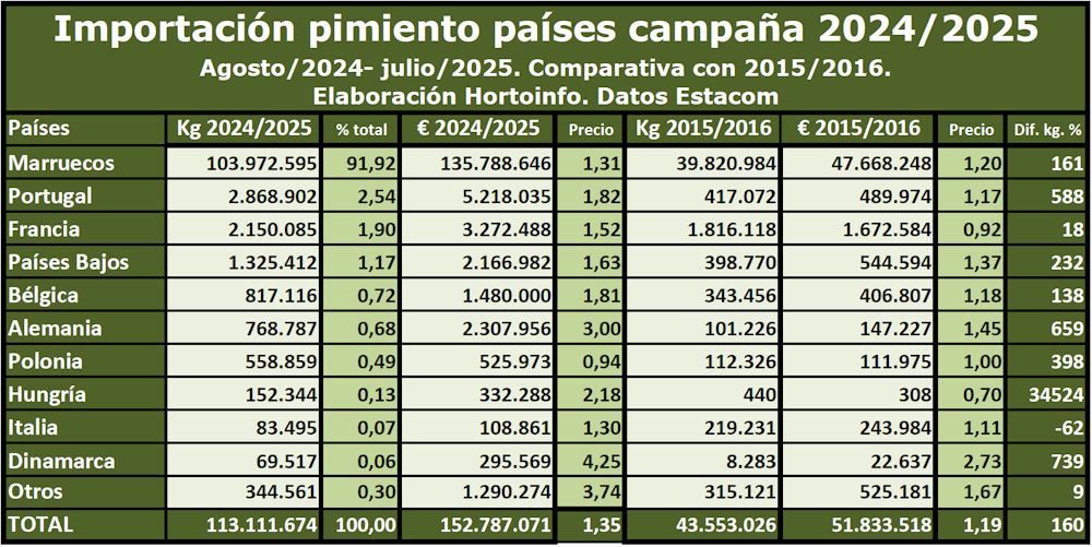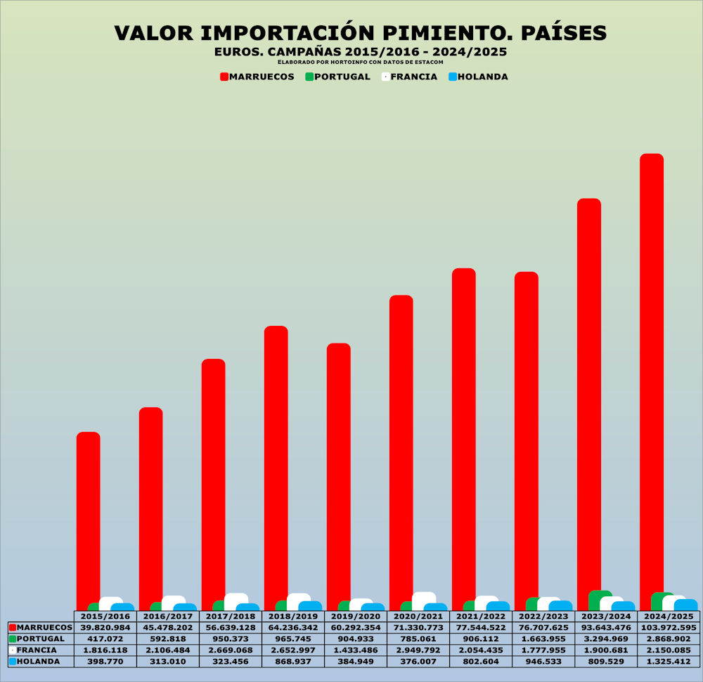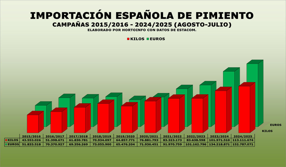 En la campaña 2024/2025 España ha comprado a otros países la cantidad de pimiento más alta de la historia, un total de 113,11 millones de kilos por un valor de 152,79 millones de euros, con un precio medio de 1,35 euros por kilo según recoge el informe que ha elaborado Hortoinfo utilizando datos del servicio estadístico Estacom (Icex-Agencia Tributaria), con código 070960 del Arancel Integrado de las Comunidades Europeas – TARIC, cifras correspondientes al periodo comprendido entre el 1 de agosto y el 31 de julio de cada campaña.
