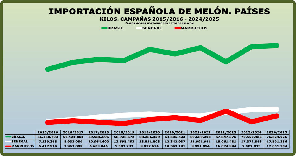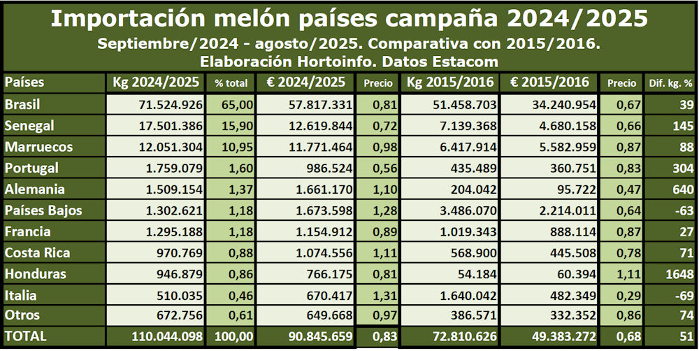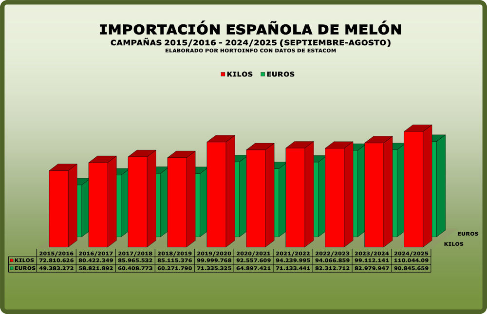 En la campaña 2024/2025 España ha comprado a otros países la cantidad de melón más alta de la historia, un total de 110,04 millones de kilos por un valor de 90,85 millones de euros, con un precio medio de 0,83 euros por kilo según recoge el informe que ha elaborado Hortoinfo utilizando datos del servicio estadístico Estacom (Icex-Agencia Tributaria), con código 080719 del Arancel Integrado de las Comunidades Europeas – TARIC, cifras correspondientes al periodo comprendido entre el 1 de septiembre de 2024 y el 31 de agosto de 2025.