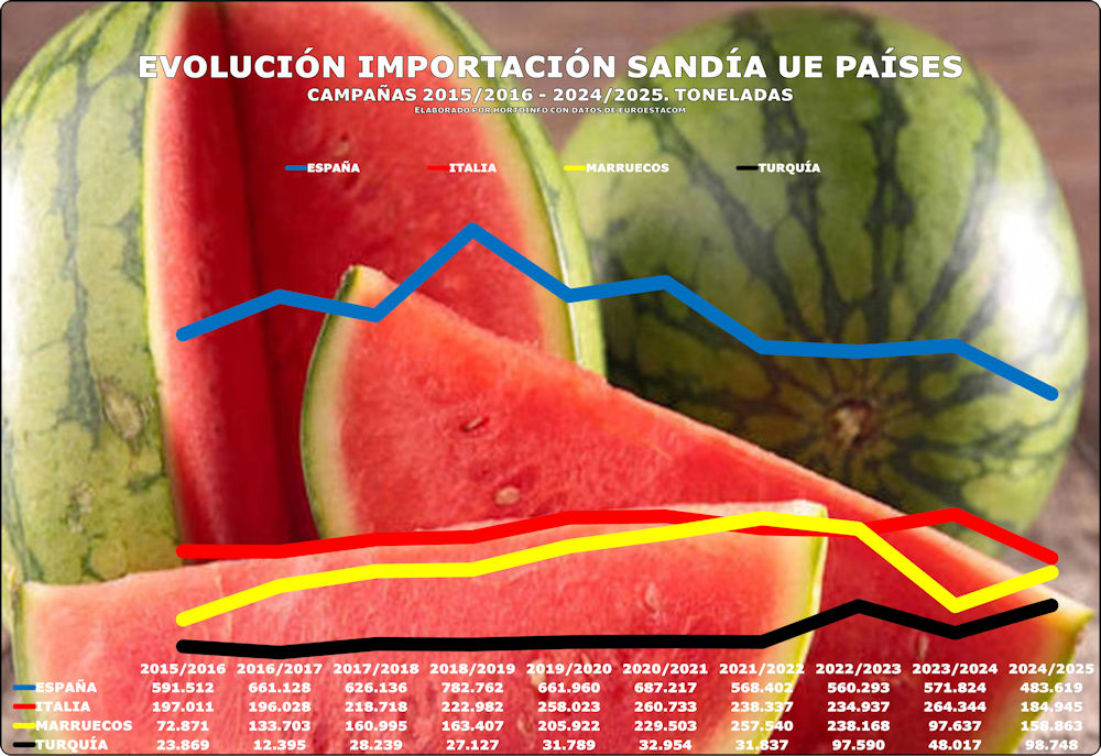 Mientras las ventas de sandía por parte de España han bajado un -18,24 por ciento en las últimas diez campañas, la de Italia un -6,12 y las de Grecia un -14,9 por ciento, las suben Marruecos en un 118,01 por ciento, Alemania un 75,99 por ciento y Holanda un 56 por ciento, estos dos últimos por reexportaciones.